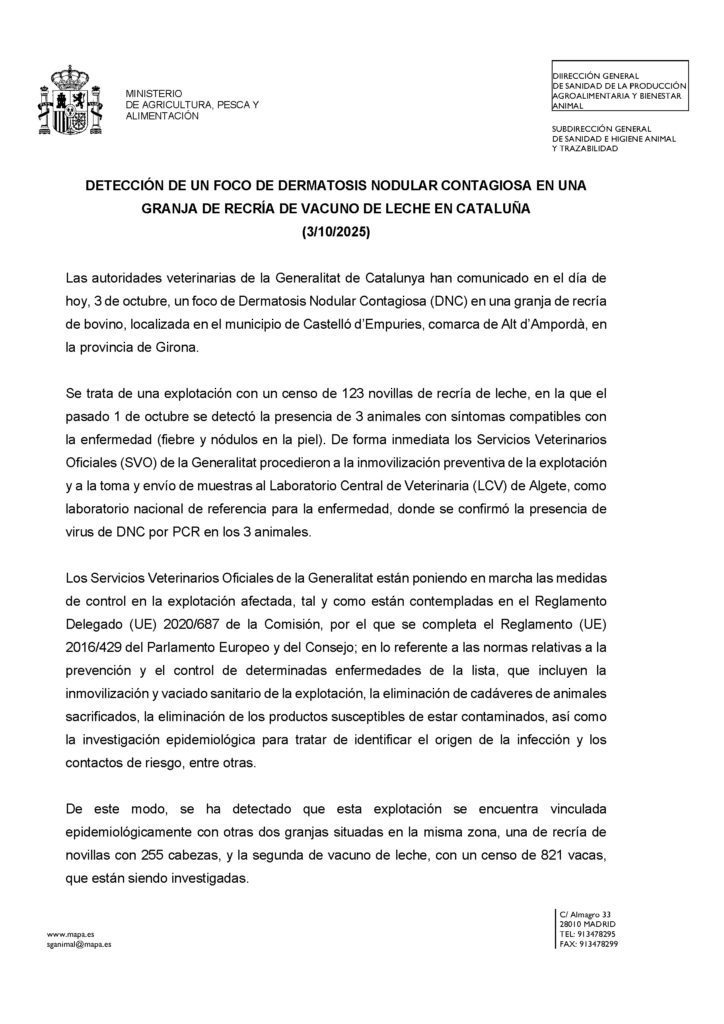 Detectado el primer foco de Dermatosis Nodular Contagiosa en el Estado (Girona).