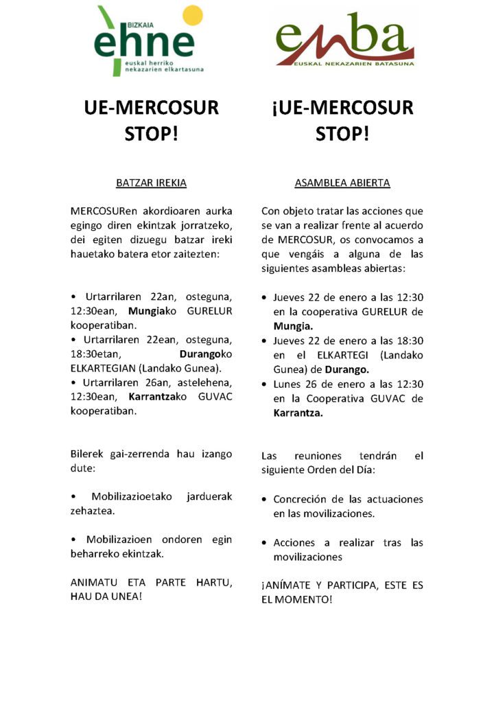 EHNE Bizkaia y ENBA Bizkaia convocan una movilización en Bilbao para el 29 de enero, en el contexto de las movilizaciones sindicales agrarias. Los tractores vuelven a la calle para pedir al Parlamento Europeo que rechace el acuerdo de UE-Mercosur y nos sumamos a la oleada de movilizaciones para gritar ¡UE-MERCOSUR STOP! Los tractores partirán en distintas columnas desde todo el territorio, para concentrase en la explanada de San Mamés e iniciar conjuntamente el recorrido hasta el teatro Arriaga.