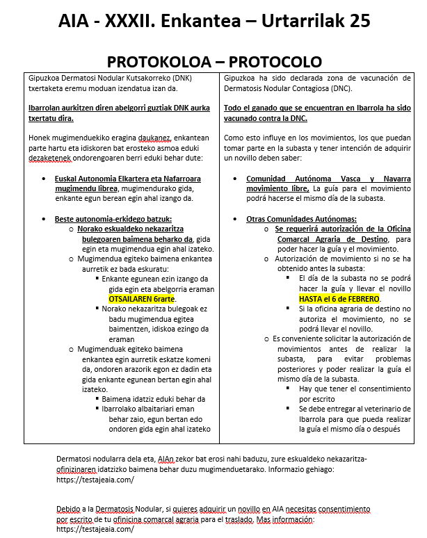 Descripción: El próximo domingo, 25 de enero, tendrá lugar en el Centro de Testaje de Aia (Gipuzkoa) la XXXII Subasta de novillos de aptitud cárnica de las razas Limusin, Pirenaica, Blonda de Aquitania y Charoles y de reproductores jóvenes (RJ + RP) de la raza Limusin y Blonda de Aquitania.